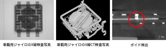 車載用MEMSジャイロについてアセンブリプロセスの評価を実施した結果、セラミックパッケージ内部のコンタクトのボイド、軟質樹脂体中のボイドが検出されました。また、メタルベースとベース上のジャイロが軟質樹脂体により支持されているため、内部接続ワイヤへ、機械的ストレスが印可される危険性があることが判明しました(メタルベース部が可動することにより、パッケージからジャイロに接続しているワイヤが変形するため、過度な長期間の振動はワイヤ破断につながる危険性が考えられます)。これらを踏まえ、振動、衝撃試験等を行い、ワイヤへの影響を検証するなどのご提案をいたします。